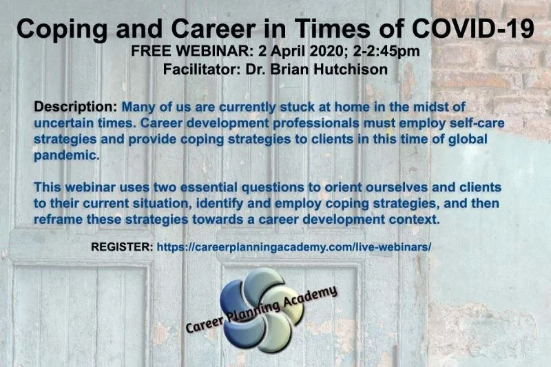 In this first episode, Global Career Guy Dr. Brian Hutchison helps career service professionals understand and adapt to the shifting dynamics of working with clients during the pandemic. Using the framework from his course Uncenter Work to Recenter Life, part of the Advanced Career Facilitation for the 21st Century curriculum found at careerplanningacademy.com, participants learned to develop coping strategies before working on career design. Participants from Barbados, Canada, Egypt, Israel, Kingdom of Saudi Arabia, New Zealand, Pakistan, Philippines, Singapore, USA and Qatar attended.